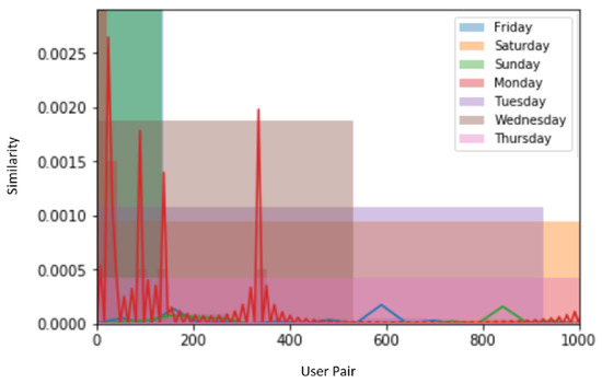 For weekends, i.e., Saturday and Sunday, the lowest similarity reached zero and the highest similarities were 0.000020 and 0.00008 as the number of active users was quite less due to the absence of academic activity. In Figure 4, we compared the similarity characteristics of those users who have common mobility behaviors based on location and time. The comparative analysis of 7 days shows a very high similarity on Monday.