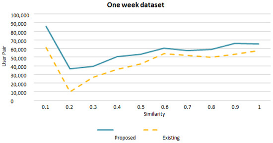 The comparison results show a similar pattern with the increased number of similarity–user pairs in SAA as shown in Figure 4. The x-axis shows similarity and the y-axis shows user pairs.