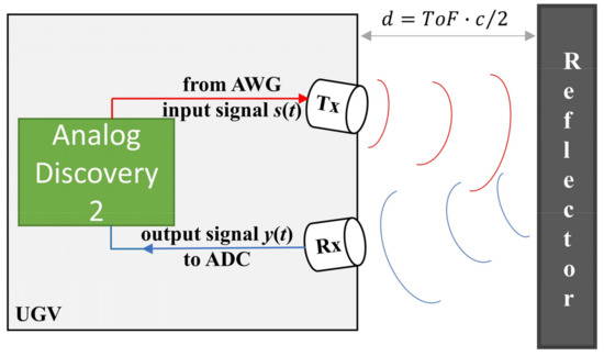 Figure 1 shows that measuring the distance between a potential sound reflector close to the UGV, e.g., other UGVs or an obstacle, relies on the accurate estimation of from the output signal , with being the time taken by the input ultrasonic signal to travel from the Tx to the Rx after reflection from an object. Once the is estimated, the distance is obtained using Equation (1).
