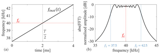 Figure 2a shows an example of the for a linear chirp signal with = 47.5 kHz, = 52.5 kHz, and = 4 ms, while Figure 2b depicts its frequency spectrum obtained using the fast Fourier transform (FFT) algorithm.