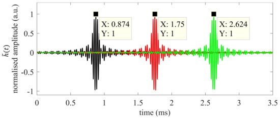 Thus, Equations (6) and (7) are simply a correlation between the received signal and the matched filter, where the maximum amplitude of the correlation output is at if no delay between the two signals is found, i.e., . When a reflector is placed at , then the correlation peak of obtained from Equation (6) shifts accordingly. This concept is shown in Figure 3, where three waveforms ) have been time-shifted so as to mimic the reflectors at distances equal to 300 mm, 600 mm, and 900 mm, using the same chirp parameters as in Figure 2. Note that for the sake of clarity, no sound attenuation is here taken into account. The different s are, thus, estimated via the correlation-based approach as per Equation (9):