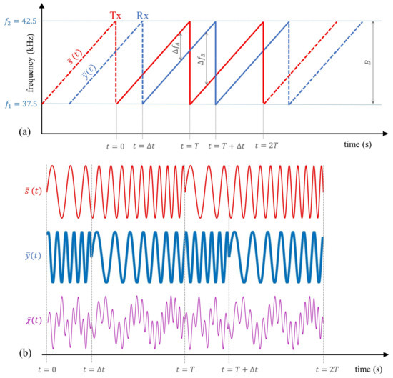 In FMCW-based estimation, the Tx is excited via a periodic chirp signal—at least two periods are needed—, and the Rx receives the output after being reflected from a potential reflector. In the ideal noise-free situation, can be assumed to be just a shifted replica of , = . In order to retrieve the value, is multiplied by , thus obtaining a periodically mixed signal that contains a beat tone whose frequency is strictly related to the time shift between the Tx and Rx signals. In fact, if > 0, then and have different values for instantaneous frequency, , and a beat frequency is produced by mixing them up [57]. In order to gain a better insight into this, Figure 4 shows a sketch of the FMCW basic working principle.