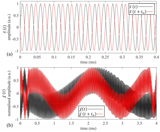 Figure 4a shows that a time delay, between and results in the two values for the instantaneous frequency differences and in a single period since a fictitious time shift = appears due to the periodic nature of the signals. Thus, and are equal to