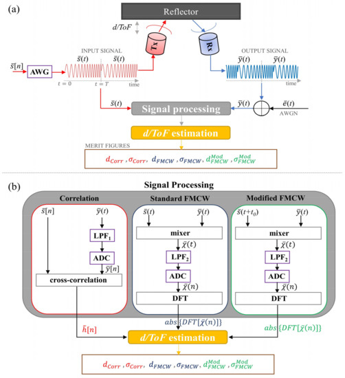 In order to consider the constraints of the FMCW-based approaches, a maximum measurable distance range of 680 mm has been simulated. The signals and have been simulated by generating a signal at and then also generating a signal with the same rate and with different delays linearly-distributed in the interval so as to sweep the range of distances mm at increasing increments of 3.4 mm. Note also that a has been generated for the modified FMCW-based approach in the same way, whereby the nonzero phase shift has been chosen to be = 0.2 ms.