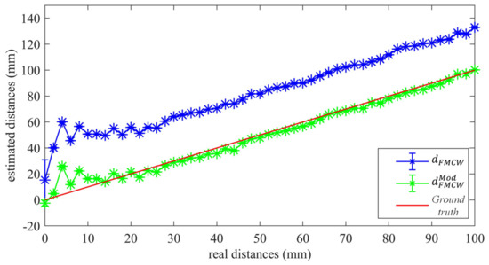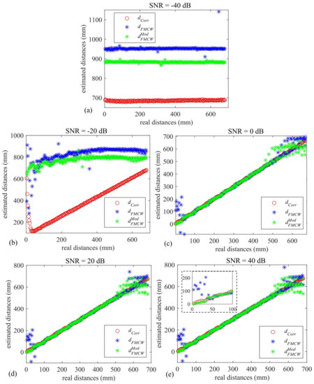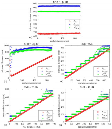 For increasing the values of SNR (see Figure 8c–e), all the techniques estimate the real distances very well, with the highest accuracy given by the correlation method, as expected. It can be seen that the modified FMCW approach estimates distances <50 mm slightly better with respect to what is achievable with the standard FMCW; a narrower distribution of the modified FMCW plot (green-starred) with respect to the standard FMCW is visible at distances < 100 mm. It is worth noting that the modified FMCW agrees well with the standard FMCW results across the whole inspected range, thus leaving the range estimation capability unaltered. In order to evaluate the repeatability of each of the employed schemes, Table 2 reports the value of the total standard deviation , , and in millimeters for each of the SNR values, except for -40 dB. It can be seen that the repeatability of both the FMCW approaches tends toward that of the correlation approach as the SNR increases.