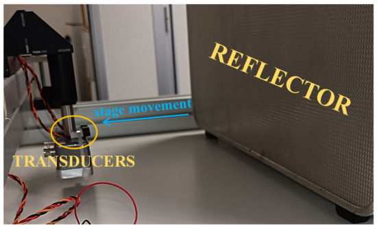 Experimental measurements were performed to corroborate the promising findings of the numerical simulations using the same hardware and chirp characteristics described in the previous sections. Figure 10 shows a photograph of the experimental setup. The two transducers were arranged as pulse-echo, with their closest sides being 15 mm away from each other. The transducers were originally placed in contact with a large reflector (i.e., at 0 mm), this being a 4 mm-thick aluminum plate, and were then moved further away from it by means of an in-house motorized scanning stage. The overall distance range was 0–100 mm in steps of 2 mm; a total of 100 measurements were recorded at each increment of distance so as to gain robust statistics. The signal generation, standard and modified FMCWs implementation with the three-point parabolic fitting, and stage movement were managed using a Virtual Instrument (VI) developed in LabVIEW. The measurements were carried out at room temperature, i.e., 20 °C, where the speed of sound in air was 343 ms−1.