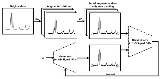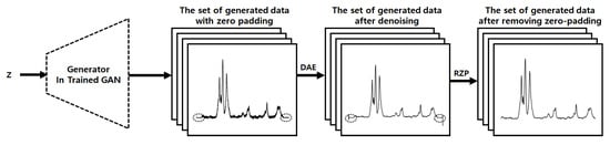 To generate Raman spectrum data properly, the proposed system utilizes various neural network models and techniques. First, the DA is used to secure sufficient amounts of initial data to train the GAN. DA is a universal model-independent data side solution that can help networks overcome small datasets [,]. After that, the system utilizes the GAN to generate many, and more diverse data. GANs aim to generate fake data by training a pair of competing networks, the generator and the discriminator. GANs are used in a variety of fields, such as image synthesis, semantic image editing, style transfer, image super-resolution, and classification [,]. In addition, the system utilizes the DAE to alleviate the excessive noise included in the data generated by the GAN. DAE is a technique widely used to reduce noise, and it is trained to reconstruct clean results from corrupted inputs by modifying the autoencoder [,]. Moreover, our system utilizes ZP, which is a technique that fills the edge of the data with zero values. ZP has been mainly used to make input and output sizes the same by preventing the size of output data from decreasing [,]. However, our system utilizes the ZP in a way that is different from the ordinary ways other researchers used ZP. By utilizing the ZP, the proposed system makes the artifacts occur on the padded region, and then the system removes the region, which eliminates the artifacts without decreasing the size of the resulting data.