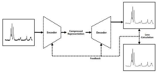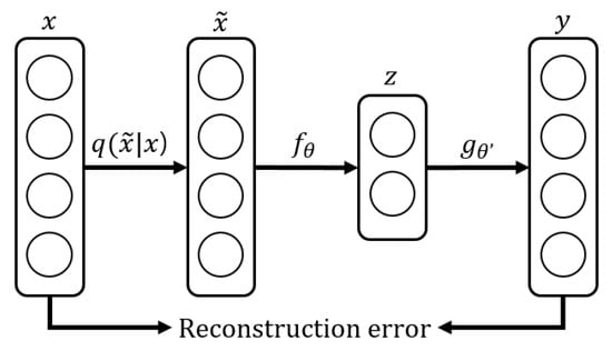 DAE has the same encoder and decoder as the autoencoder, but there are some differences in the learning process, represented in Figure 3. We describe the mathematical explanation of DAE with reference to []. Figure 5 briefly shows the overall flow of the mathematical operations in DAE. First, the random noise following the probability distribution, , is added to an input vector, x. Then, the encoder with the parameter , uses as an input and outputs a latent vector, z. Similarly, the decoder with the parameter , outputs y by using z, and the difference between x and y is the reconstruction error. This loss can be minimized by optimizing the parameters of the encoder and the decoder as follows: