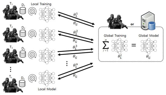 Using FL, devices participating in learning do not need to send raw data to the server, which improves security and privacy and reduces communication resource usage. Thus, FL is a suitable learning method for distributed systems, and many researchers have tried to leverage FL to perform DL in distributed systems. Chen et al. presented an FL-based intrusion detection algorithm to ensure the security of wireless edge networks []. Wang et al. proposed an FL-based pedestrian detection scheme that gathers data from multiple vehicles to achieve secure multi-party computation in vehicular scenarios []. Sharma et al. proposed a distributed computing defense framework using FL to resolve the challenges of limited training data and avoid a reason-specific model []. On battlefields, devices are usually distributed, and communication resources are not abundant. In addition, security is very important, so strong encryption is essential for every data transmission. Therefore, several studies have utilized FL for military uses [], but there are not many studies yet.