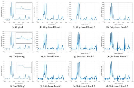 Gaussian noise is the most commonly known noise that exists in all frequency bands. This noise is easily seen in nature and also exists in the Raman spectrum data [], so jittering with Gaussian noise was chosen as one of the DA methods. Shifting is an augmentation method that moves each value of data in a certain direction without modifying the overall form of the data. Thus, it can be utilized to imitate the changes in the peaks’ location of the Raman spectrum due to the influence of the environment when measuring a chemical. The shifting moves values in a vertical or horizontal direction in general, but only the horizontal moving was used in the proposed system because the peaks in the Raman spectrum generally move horizontally.