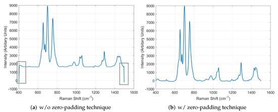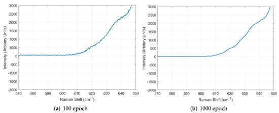 Through the denoising process described in Section 5.3, the proposed system was able to generate a large number of data, including reasonable variations. However, at both ends of the generated data, there were artifacts that had not existed in the original data. Therefore, the system utilized the ZP technique to eliminate the artifacts in the last step described in Figure 4. Figure 11 shows the Raman spectrum data generated by the system with and without the ZP technique. As shown in Figure 11a, the values in the end regions soar when the ZP technique is not used. However, using the technique, the artifacts were eliminated well, so the system was able to obtain realistic Raman spectrum data.