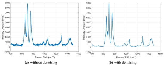 In today’s battlefields, chemical agents are very dangerous weapons that threaten soldiers. Chemical agents have been developed in the past and continue to emerge as new substances. Thus, it is important to detect chemical agents rapidly and accurately on battlefields. Raman spectroscopy is a widely used method for detection. Raman spectrum is obtained from Raman scattering, which is a kind of inelastic scattering phenomenon []. It is possible to obtain information on a chemical by analyzing the scattered light emitted when a single color light is projected on the chemical sample. In Raman spectroscopy, the degree of shift compared to Rayleigh scattering is expressed as Raman shift, and the Raman spectrum has peaks in various forms depending on the amounts of scattered photons. Such peaks’ distinguishing forms can be used to identify the structural components of the chemical sample []. In addition, Raman spectrum data can be measured non-destructively and easily, regardless of the condition of the sample.
