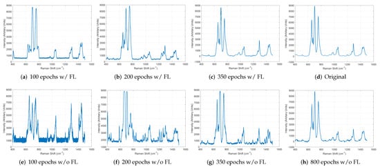 The proposed system leverages FL to enable cooperation among decentralized troops and faster learning. To evaluate the performance improvement when using FL, we conducted the experiment, supposing that five troops performed FL. In this experiment, each troop had 100 augmented Raman spectrum data and conducted the training using FL on the proposed system. While training, we looked into the result data of one troop at 100, 200, and 350 epochs to analyze the training performance. Figure 12a–c show the results when the system utilized the FL. As shown in the figures, the training was performed much faster, and the result generated at the 350th epoch was sufficiently similar to the original presented in Figure 12d. On the contrary, without using the FL, the system performed training slowly, and the generated data after about 800 epochs were similar to the original. This experiment result proves that the proposed system can build the models more quickly and efficiently without exchanging raw data between the troops by leveraging FL, which improves the system’s practical feasibility on real battlefields.