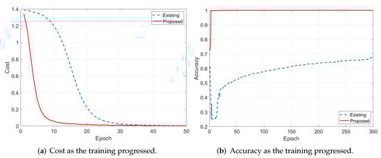 Through Section 5.1, Section 5.2, Section 5.3, Section 5.4, Section 5.5 and Section 5.6, we validated that the proposed system trains the models quickly and generates realistic Raman spectrum data well. As we mentioned before, sufficient amounts of data for training are required to build the AI-based chemical agent detection system, so we devised the proposed system. Thus, in this subsection, we conducted an additional experiment to analyze the effect of the application of the proposed system. For this experiment, we built the convolutional neural network (CNN)-based model for chemical agent classification and trained the model using two datasets. One was the dataset based on the collected real data, and the other was composed of data generated by the proposed system. Naturally, the amounts of the real data were less than those of the generated data, which caused slow training. Thus, for fair evaluation, the real data were duplicated to equalize the amounts of data in the two datasets. Figure 13a shows the cost values in the training process, and we can see that the training was performed much faster when the proposed system was used. Further, as shown in Figure 13b, the classification model trained using the dataset generated by the proposed system outperformed the model that utilized the dataset based on the collected real data. Repeated use of only a small number of data caused a lack of diversity in training data, which resulted in the poor classification performance of the existing system. These results validated the effectiveness of the proposed system.