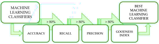 The evaluation of the machine learning algorithms was carried out by considering accuracy, recall (or TPR) and precision (or PPV). The accuracy is used to evaluate the number of correct classifications, while the recall evaluates the number of data samples correctly identified in a particular class. Finally, the confidence to belong to a particular class for a particular prediction is defined by the precision. Furthermore, the goodness index was calculated and used to assess the best machine learning algorithm for each classifier and dataset combination.