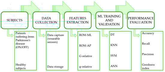 The use of wearable sensors is part of the broader goal of integrating and interconnecting sensors and actuators with control systems and smart materials []. These kinds of sensors are becoming prominent in healthcare for measuring various biomechanical parameters [,]. Wearable sensors are easy to set up, relatively inexpensive and can be used in real-time since the processing phase is much shorter than the computing time required by some standard systems (e.g., marker tracking algorithms) []. However, the large-scale, high-dimensional data captured by wearable sensors requires sophisticated signal processing to transform it into scientifically and clinically valuable information, thus precluding their routine application in daily practice []. Providing clinicians with quantitative and automatic measures of motor and postural performance through portable sensors would allow the early detection and management of postural instability in PD. By automatically managing large volumes of data, machine learning algorithms have shown remarkable success in making accurate predictions for complex problems, including healthcare issues [,,].