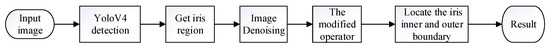 We used MobileNetV2 to improve YOLO v4 and design an iris detector. The detector employs a small rectangular box that tightly surrounds the iris region. The iris region allows us to approximate the position of the pupil center. The improved integro-differential operator was used to precisely locate the inner and outer boundaries of the iris, greatly improving iris location robustness. Figure 2 depicts the flow chart of the localization algorithm.