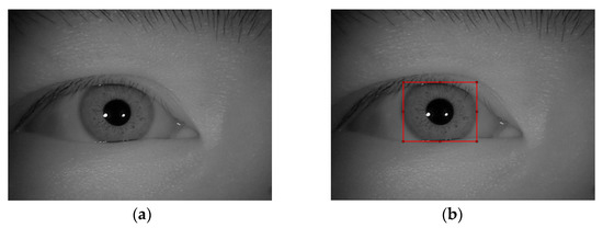 The iris images in the CASIA-Iris-Distance dataset were captured by a high-resolution camera over a long distance. As a result, the image area of interest included both binocular irises and facial patterns. It contained 142 themes and 2567 pictures. Each image had 2352 × 1728 pixels. Figure 3c is a sample of the dataset. The imaging system of the high-resolution camera can actively search for patterns in the field of view, such as the iris and face, to identify users from a distance of about 3 m.