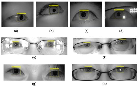 In recent years, deep learning has rapidly developed in the field of target detection. There are currently two main approaches: one-stage detection and two-stage detection. The two stages are based on the concept of a target candidate box, generating a series of sample candidate boxes in advance, and then classifying samples through a convolutional neural network. The region-based CNN (R-CNN) is one of them. Feng X et al. [19] proposed an iris R-CNN. It can simultaneously complete the accurate segmentation and localization of the iris in a non-cooperative environment under visible light. Li Y H et al. [31] designed a fast R-CNN with only six layers to locate eyes. He used the bounding box found by Faster R-CNN to locate the pupil area using the Gaussian mixture model. Because R-CNN needs to select thousands of proposed areas from one picture, the speed is very slow. One-stage detection is based on regression, and there is no target candidate box. Image features extracted via the backbone network are returned to the object boundary box directly. It is faster than R-CNNs, such as YOLO models [32,33,34,35,36]. YOLO has attracted wide attention since its inception.