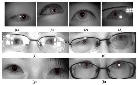 Inner and outer boundaries of iris localization by improved operators under non-cooperative environments [22]. (a) Off-angle iris; (b) iris obscured by eyelids; (c) iris interfered with by eyelashes; (d,e) iris with specular reflection; (f) off-angle iris at a long distance; (g) iris obstruction due to hair; (h) glasses obstructing the iris [22].