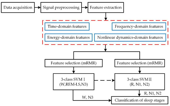 The scheme of the sleep stage classification process adopted in this study is described in Figure 1, including data acquisition from sleep recordings, signal preprocessing, feature extraction, feature selection, and classification. The original sleep recordings were collected from the Sleep-EDF database [28,29], and we chose the data from the Fpz-Cz channel to analyze [30]. The wavelet threshold denoising (WTD) method and wavelet packet transformation (WPT) method were applied in the process of signal preprocessing to obtain six kinds of characteristic waves. After this, a comprehensive feature system with time, frequency, and nonlinear dynamics domains was made up. Subsequently, the minimum redundancy maximum relevance (mRMR) algorithm was used to select the most effective features. Finally, we obtained the cascaded SVM models with these selected features as the inputs. The final classification results were a combination of the calculation results from the two SVM models.