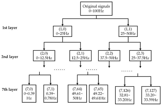 To obtain the characteristic waves from every denoised epoch, the WPT method was applied to obtain the corresponding frequency bands. The WPT method allows precisely resolving the brain rhythms into packets whilst demanding a relatively low computational cost [33,34]. To obtain all these characteristic waves, we constructed a wavelet packet tree with 7 decomposition levels to obtain the frequency band resolution of around 0.39 Hz. As seen in Figure 2, the wavelet packet coefficient of the j-th node in the i-th layer was named , which represented a decomposed frequency band. We chose suitable nodes according to different characteristic waves’ frequency bands. By connecting these nodes’ frequency bands from low to high, a frequency band covering the required characteristic wave was formed.