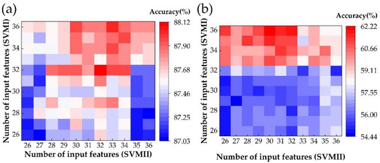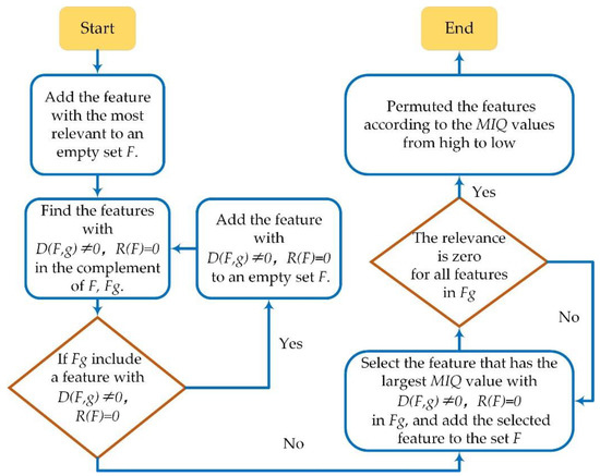 where and were different feature sets: . |F| was the number of the total features in F, which was 51 in this study (details in Appendix A.3, Table A2). The analysis process of the mRMR was shown in Figure 4.