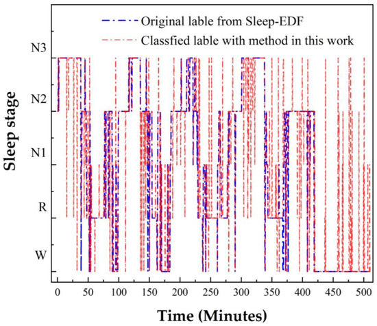To verify the performance of this proposed method for long-term applications, we compared the classification results with the method in this work and the original result from the Sleep-EDF data set (SC4001) as an example, shown in Figure 5.