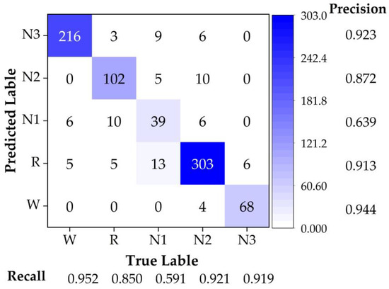 The accuracy result for this case (SC4001) was 89.22%. It was clear that this method could be applied for continuous data analysis. To obtain more details about the classification result, we acquired the confusion matrix as shown in Figure 6. The most accurate stage was W, with a precision of 94.4%. In addition, due to the optimized model we acquired the precision of the N1 stage to be high, up to 63.9%. As in the confusion matrix, the total accuracy of this case was defined as in Equation (22):