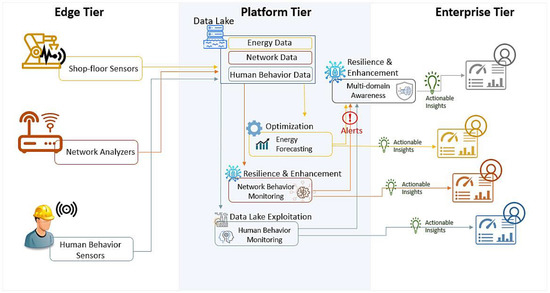 Considering the SMS-DT platform, on the shop floor or edge tier, several events are tracked: equipment, sensors, humans interacting with each other, humans interacting with robots and terminals, robots that communicate with each other, etc. Information such as equipment state, energy sensor measurements, human facial images, human interaction with mouse and keyboard, and network traffic can be captured and sent to a data lake in the platform tier, where all information is stored. A data processing module acts as a data broker, feeding and receiving data from the other modules. The data are pre-processed according to the data modality, e.g., filtering noisy data on an image or audio record, or missing records from a sensor are removed or replaced by default values. Furthermore, in multi-modality approaches, the data are aggregated from different data sources and stored in a data lake. The digital twin module mirrors the cognitive status of the employees, energy, and network state. Using intelligent techniques, these different modules monitor, detect, and predict issues in the system. As a result, they send alerts to a multi-domain component that correlates all the alerts to obtain universal monitoring of the occurring events. The correlator also assists in establishing cyber situational awareness and adopting suitable countermeasures in case of attacks. All the information in the different modules can be visualized in different dashboards, aggregated in a common visual interface at the enterprise tier. Here, it is possible to display a summary of the different events and the alerts generated in real time.