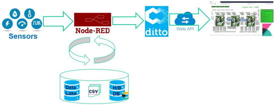 Technically speaking, many companies do not have the expertise or resources required to effectively implement digital twins. This becomes even further complicated considering the lack of consensus on unified concepts, standards, technologies, and procedures [41]. Several software solutions exist to implement digital twins; however, most of them are focused on only one specific digital twin specification. Moreover, the main solutions are proprietary software designed to fulfill the company’s product aim. From the few open-source solutions available, we have identified Eclipse Ditto and ThingsBoard as the most interesting ones. ThingsBoard [46] allows for the collection, processing, and data visualization of many devices. It generates alarms through a rule chain engine. On the other hand, Eclipse Ditto [47] is designed for the Internet of Things. It holds models of “things” as JSON objects, and it has an API that supports HTTP, WebSocket, and other industrial protocols such as MQTT.