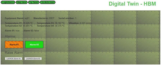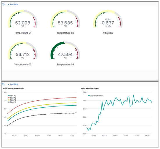 The sensor information is read from the data lake through the Node-RED application. Node-RED is a Node.js-based relay application for wiring together hardware devices through messages exchange, which we used as an information broker. It reads sensor data and inserts it in bulk in our database. The information gathered from the sensors is then stored in ElasticSearch, a highly scalable NoSQL database with a powerful search and analytics engine. ElasticSearch along with Kibana and Logstash composes the open-source ELK Stack [56]. We used ElasticSearch to store data, such as sensor readings and test results, in a way that can be scaled for an industrial environment. Kibana is a data exploration and visualization tool that runs on top of the ElasticSearch database. We used it to provide the equipment data visualization dashboards for the digital twin. A graphical user interface was developed, and Kibana dashboards were embedded in order to assure easy access to all this information.
