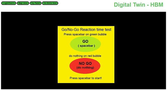 Therefore, we developed a Go/NoGo test framework that can be accessed by the digital twin interface presented in the previous section (Figure 7). On a normal textile shop floor, it is usual that operators need to react to some machine alarms. Thus, our aim was to redirect the operators to this testing framework if an anomalous reaction time to this alarm was detected. The framework developed has two variations of the tests. First, a basic Go/NoGo test is triggered. Then, on the basis of the results, the framework can question the user about their fatigue level using a USAFSAM fatigue scale [62]. We think that providing workers with early warnings about their fatigue level can allow better fatigue management and thus improve the operator’s performance.