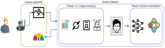 In this context, we decided to study how facial emotion recognition [64] and speech [65] can be used to detect and classify the subject’s emotions. From our study emerged the Human Behavior Analyzer, a tool that we developed to monitor the emotions of shop floor workers. This module captures and analyzes behavioral signs via two integrated components: the camera application (CA) and the emotion detector (ED). The former keeps track of the operator’s emotions and records real-time footage of the user via a webcam. The latter classifies the emotion expressed in the images captured by the webcam. Both components are implemented in Python using frameworks such as PyQT, FastAPI, and OpenCV. As described in Figure 8, the CA captures footage of the operator and sends it to the ED. In turn, this component starts the classification process, which consists of three processing and one classification phases: (i) image preprocessing; (ii) person identification; (iii) face identification; and (iv) emotion classification.