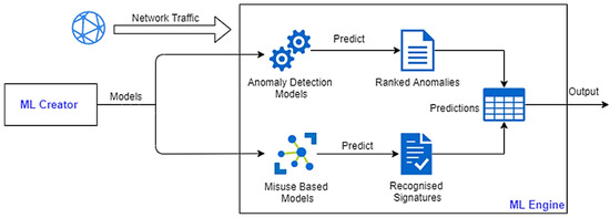 Therefore, we built a machine learning engine that works together with Suricata IDS to identify different threats. The ruleset of the Suricata IDS instance used was extended with rules designed according to the investigated shop floor to match its specific threats and anomalies. This ruleset is completely flexible and allows the administrator to add new detection rules. Each rule consists of an action (what happens when the signature matches), the header (protocol, IP, ports, direction), and options. When a match with a rule occurs, an alert is raised (according to the action defined). The ML engine was developed to help in the detection of new attack patterns and new vulnerabilities. The structure of this engine is described in Figure 9. The ML engine receives the network traffic and uses anomaly detection (unsupervised learning) and misuse-based (supervised learning) models to detect attacks and anomalies. Then, this information is outputted to help in the detection of security incidents.