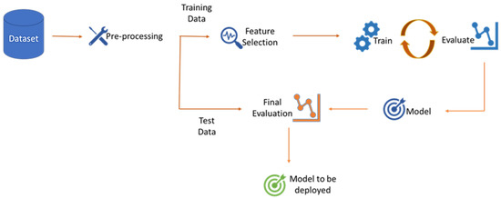 Training and evaluation: the training process occurs after carefully splitting the available data into train and test sets and putting away the testing set for later use. If the data are enough, the train set is further split into a validation dataset that is used to evaluate every model trained in the training set until a performance goal is achieved. In the last instance, the model is tested on the test set, and if the results are satisfactory, the model is deployed. In the case of data shortage in the training set, the model can be trained using cross-validation, where the training set is split into k parts or folds, and then the model is tested independently on each of the parts while being trained on the aggregation of the other k-1 parts. The performance is then calculated as the average of the performance of all folds.