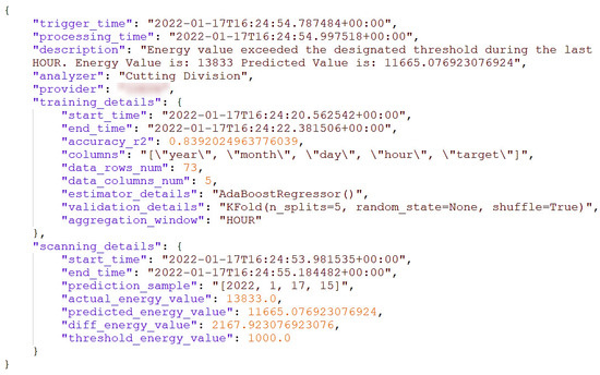 Furthermore, one of the key features of the developed tools is to analyze the actual power consumption for a set of observers/sensors in real time. Using machine learning models, the energy analyzers predict future energy records for each observer, compare actual and predicted values, and generate forecasting-based alerts. To achieve this goal, the analyzer runs through two periodical phases. The training phase is when a training scheduler for each observer is set and triggered. In this phase, the latest historical energy consumption data for the observer are retrieved and pre-processed. Then, they are aggregated into a specific timestamp and used to train a supervised ML model, resulting in an up-to-date trained prediction model for each subscribed observer. We designed an input data adapter to extend the energy analyzer to retrieve power records from multiple channels, including APIs, databases, and static MS Excel files. On the other hand, the scanning phase is when a scanning scheduler for each observer is defined and triggered. During this process, the actual energy consumption for the targeted observer is retrieved. The previously trained model is used to predict the expected consumption. Then, the analyzer compares both predicted and actual consumptions and assesses the difference. If the assessment found that the actual consumption exceeds the normal predicted one, an alert is triggered and sent to a broadcasting channel. For this aim, we designed an alert triggering mechanism to allow broadcasting alerts to multiple channels such as APIs, databases, and Apache Kafka topics. Figure 11 shows the JSON structure of an alert generated and broadcasted by our energy forecasting analyzer from the textile shop floor.
