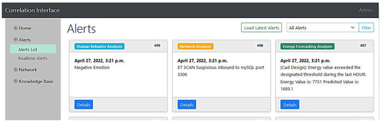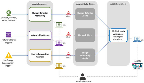 In the FoF environment, it is essential to develop mechanisms that ensure the maximum availability of production assets in crisis situations. An important issue to be considered is the correlation of the information from different sources in the FoF environment, namely, information about shop floor monitoring (energy consumption analysis and human behavior monitoring) and information about intrusion detection (network behavior monitoring). Figure 12 shows an overview of the correlation of the investigated shop floor information. As can be observed, different cyber and physical events on the shop floor are collected. These events are sent through the Kafka engine to a multi-domain correlator that will work on the correlation. Apache Kafka is a distributed publish-subscribe messaging system that maintains feeds of messages in partitioned and replicated topics [77]. All alerts broadcasting modules are producers to Kafka topics, while a consumer was implemented to read the messages from the subscribed topics. When the consumer obtains messages, it also sends them to the correlator for correlation processing.