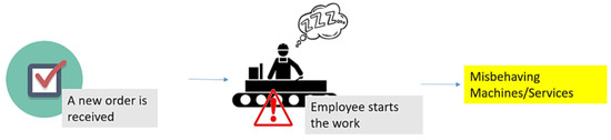 The final product can be affected by an accidental error caused by an operator. The error can be caused by using the wrong material. It can also happen due to an error on the loom that the operator cannot avoid due to their lack of attention, fatigue, or even inexperience. Therefore, in this storyline, the misbehavior of the production process is caused by an underperforming employee that, due to his tiredness level, misbehaves with the work that should be done. The product is then wrongly produced, as detected in the quality assessment stage of the production, forcing the restart of the production line. This storyline is represented in Figure 13.