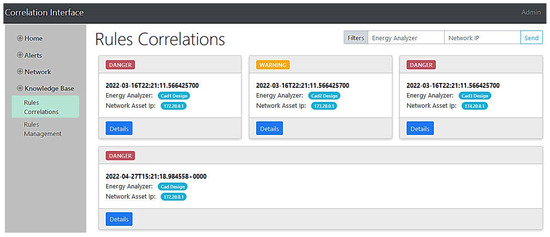 The DB is the correlating component that uses the drools engine [79] to produce inferences using the knowledge base and the calculated dynamic evidences. This component allows users to perform Create, Update, Read, and Delete (CRUD) operations on the rules that compose the knowledge base. It is also automated to perform and persist all correlations made in regard of the collected alerts. As mentioned earlier, all message-producing modules are publishers to the Kafka topic, while the DB is a consumer of the alerts produced by the different domains. This component was developed in Java and uses the Spring Framework to follow Representational State Transfer (REST) architecture. In terms of the internal process, the correlation process occurs in a configured cadence. Every time the DB reaches an execution point, it starts by consuming all alerts published during that time window. Then, the information is filtered in order to obtain a set of valuable pieces of evidence and compute new ones. These forms of evidence are then sent to the drools inference engine, which takes care of correlating the data, along with the rules registered in the knowledge base. When the inference results in a warning or a danger state, a justification is created. This confers the system a high transparency, interpretability, and explainability. The correlation interface is an interactive web-based tool to control the system and provide an overview about the SMS-DT platform and its components. Using a set of dashboards and visualization techniques, it helps operators manage and obtain details about occurring alerts and their correlations in the entire investigated environment.