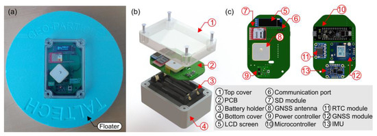 The open drifter and its basic components. (a) Drifter installed in an example float. (b) Basic hardware components. (c) Data logging module with all the components.
