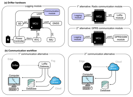 Overview of the open drifter hardware and communication architecture. (a) Hardware and communication architecture of the logging and communication modules. (b) Communication workflow alternatives between a drifter and near real-time visualization.