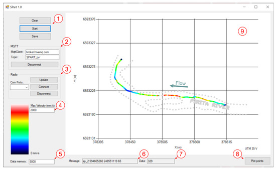 SPart software for drifter tracking with different communication alternatives. The figure shows the track of a drifter with mobile communication in the studied reach. (1) Main control menu. (2) Connection to MQTT broker. (3) Connection to Radio Gateway. (4) Velocity scale definition. (5) Number of positions on the screen. (6) Latest drifter message received. (7) The total number of messages received. (8) Load a set of reference points (gray point background). (9) Map with the received data and positions (automatically converts data from WGS84 geographical coordinates to UTM format for representation).