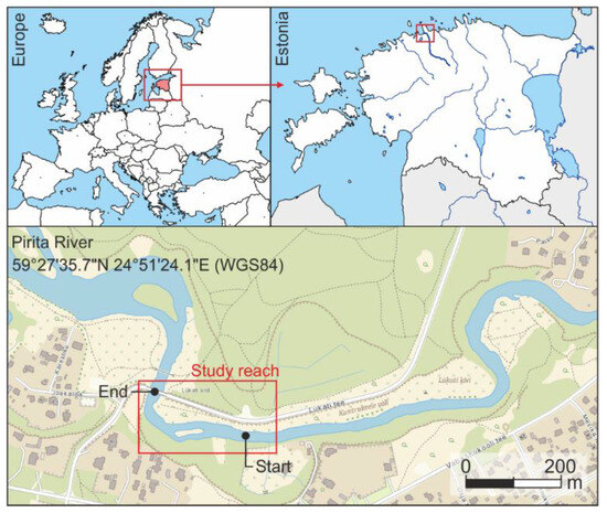 Field trials were conducted in the Pirita River (Figure 4), a 105 km long river in northern Estonia that empties into the Baltic Sea. The study reach has a length of around 300 m, with diverse hydro-morphological units (e.g., pools, riffles, or rapids). The mean water depth in the reach during the field test was mainly lower than 1 m (shallow water). Tests were conducted on the 30 May 2019, in Kloostrimetsa gauging station [8] the water level was 106 cm, the water temperature: 15.8 °C, and the air temperature: 16.6 °C.