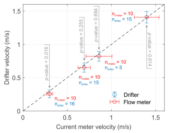 The comparison between current meter measurements and drifter’s velocity estimates only showed significant differences (α = 0.05) in the lowest velocity recorded (Figure 5). Measurements showed a strong correlation between them (ρ = 1). In general, it was found that the drifter measurements had a lower variance than the current meter, which can be explained by the fact that drifter velocity is estimated using a higher number of values per sample. The drifter data processing acts as a mean filter when calculating the velocity value, reducing the variance in each location. This is similar to [11], which reported in their tests that the larger number of values to estimate the velocity the lower the standard deviation. However, this comes at a reduced ability to resolve small-scale variations in velocity. In addition, differences between the current meter and drifter measurement were found to decrease with increasing velocity. This can be related to the design of the first test, as the drifters started with a velocity of 0 m/s in each deployment, and slowly accelerated until they reached the real flow velocity. Therefore, despite eliminating part of the beginning of the track, lower velocities will require longer times and distances to reach the real flow velocity and thus, the relative error committed in the estimate can be higher. This is an important consideration, as any obstacle that interacts with the drifter may decelerate it, spreading a small error in the first meters downstream of the obstacle. This can be solved (1) by identifying and removing such samples in the recorded track or (2) by increasing the number of data points using multiple particles and tracking the standard deviations, anomalies, and the number of samples in any location.