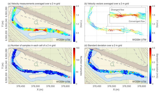 Integration of the nine independent tracks of the drifters. (a) Velocity measurements averaged over a 2 m by 2 m rectangular cell grid. (b) Velocity vectors averaged over a 2 m by 2 m rectangular cell grid. (c) Number of samples in every 2 m by 2 m rectangular cell grid. (d) Standard deviation in every 2 m by 2 m rectangular cell grid.