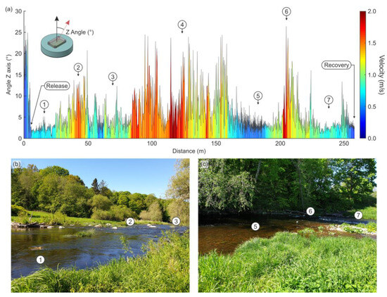 The inclination of the drifter during the studied track (raw data). (a) Evolution of the velocity and inclination during the track. This allows the differentiation of areas of different properties within the reach; (b,c) different areas and transitions. Numbers link the graph (a) with the different river arear (b,c).
