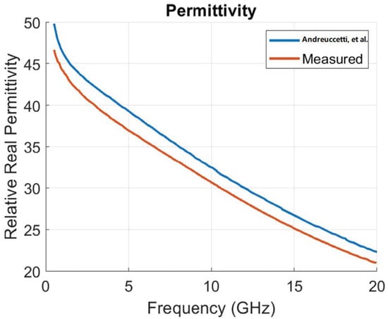 According to the instrument specification, the sample should be at least 5 mm around the probe to measure adequacy []. M. Cavagnaro et al. presented extensive work regarding this issue []. According to their findings, during measurement of a sample with high water content, such as liver, the probe should be inserted for at least 3 mm into the sample, and at least 3 mm tissue should be present between the tip of the probe and the bottom of the surface to maintain 5% accuracy threshold. Sometimes when dealing with biological tissues, these conditions are hard to follow. Some recent works were also published to understand the effect of probe position and variable thickness of tissue samples [,]. Another work by Porter et al. suggested that the tissue in contact with the probe has a greater impact on the measured dielectric properties than deeper tissues []. Considering all these studies, during our experiments, in most of the cases, we made an insertion in the liver sample, so that the probe can be inserted inside the sample, as shown in Figure 1b. Though the liver tissue samples were not always unform in thickness, the measurements were performed at multiple locations (5 mm thick location, as well as 2 mm thick location) and both inside and outside of the insertion. A standard protocol is always followed during all the measurements, so that all the measured data can be comparable. A comparative plot was also performed with measured (healthy liver tissue) average real permittivity and real permittivity (for liver tissues), as published in the literature []. Figure 2 shows our measured data closely followed the published data.