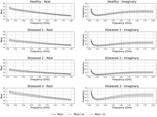 The measurement setup described in the previous section can collect both relative permittivity and loss factor of tissue at various frequencies. For this study, the measurements are saved across the 0.5 GHz to 20 GHz frequency range, with a step size of 39 MHz for each measurement. As a result of the frequency step size selected, each measurement output has 501 complex permittivity values (a total of 1002 values of dielectric constant and loss factor per measurement). Figure 3 shows the mean (solid line) and standard deviation (dotted lines) for real and imaginary components with different tissues. Figure 4 shows the average plots of all the measured data, grouped as healthy, diseased 1, diseased 2, and diseased 3. Solid lines show the real parts () of the measurements, and dotted lines show the imaginary parts (). The difference in the average of electrical characteristics between the four different tissue types can be understood by this plot. All the raw measured data plots for each sample are added in the Supplementary Material.