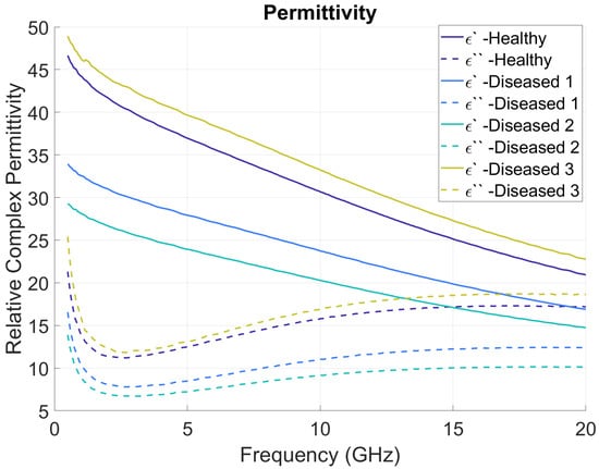 The dielectric property or complex permittivity () is a complex term dependent on angular frequency , as shown in Equation (1). The real part ()is called relative permittivity [], and it is the measure of the energy stored in the tissue from an external electric field. The imaginary part () is the dielectric loss factor, which suggests the dissipative nature of the tissue by energy absorption and partial heat conversion [,,].